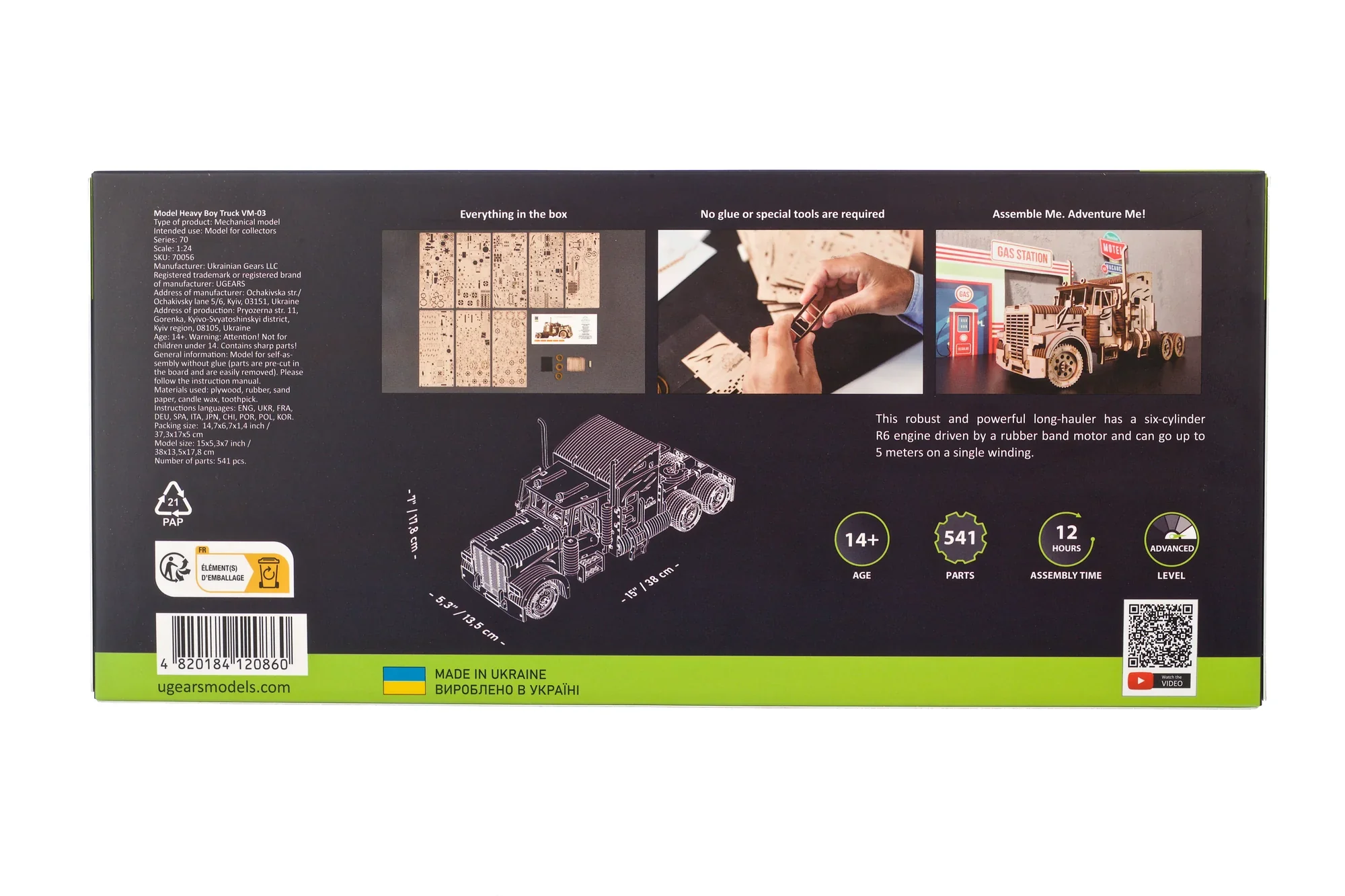 UGears Heavy Boy Truck VM-03 model kit is made of sustainably-sourced high-grade wood and has everything you need for assembly. The quality of the parts is top-notch: a laser method is used for cutting items from a plywood board that provides precise hairline cuts. The details have to be pulled out of the boards and assembled to create a complete model. Like all other UGears models, the Truck VM-03 comes with step-by-step, full-color, truly easy to follow instructions in 11 languages (Ukrainian, English, German, French, Polish, Spanish, Russian, Turkish, Italian, Chinese, and Korean) and requires neither glue nor special tools to be fully assembled into functional working Truck.