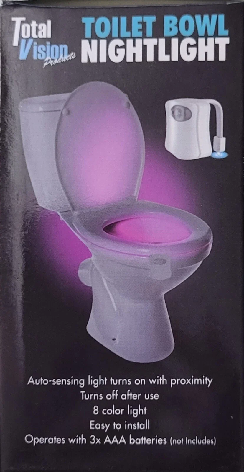 Light up your way and easily find your way in the bathroom with this Multicolored night light. The built in motion sensors allows for touch free activation from 5 ft range. The light will automatically shut off after each use. The 8 color options lets you choose your favorite color. Installs in minutes. Operates with 3x AAA batteries (not included).