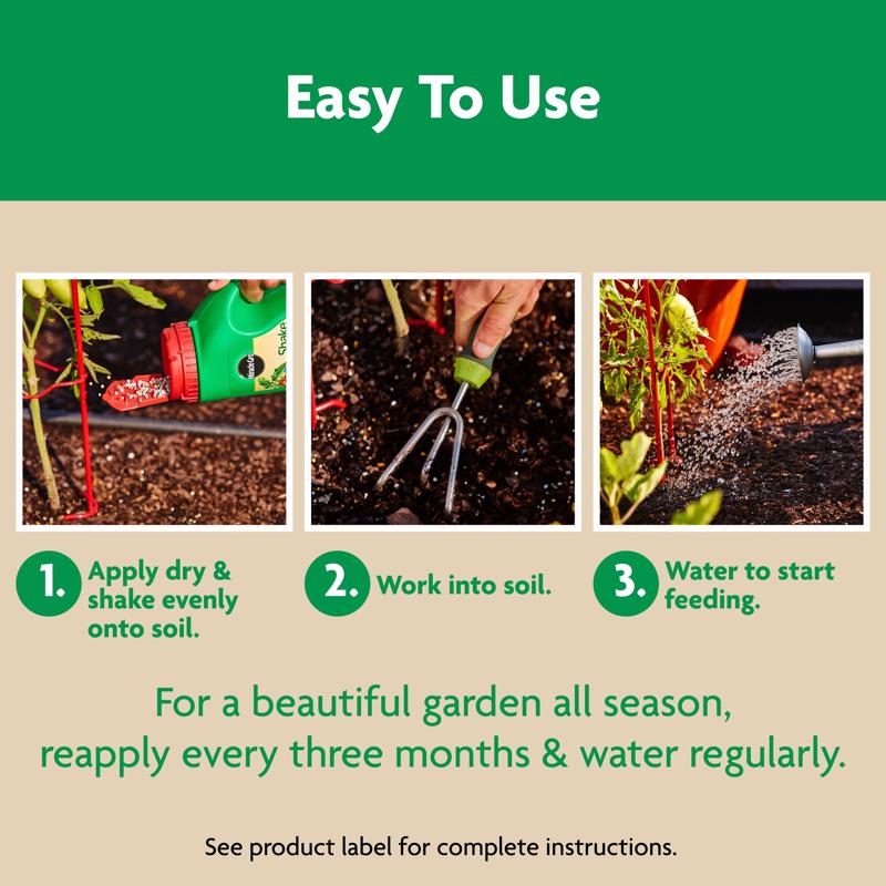- Ongoing care: Reapply Miracle-Gro Shake 'N Feed Tomato, Fruit & Vegetable Plant Food every 3 months and water regularly for a beautiful garden all season long